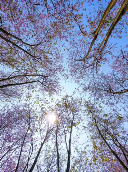 2.蓝田紫林专属风貌:记录蓝田紫林春日宫粉紫荆、黄花风铃木等花海景观、景区打卡点、花卉特色细节;