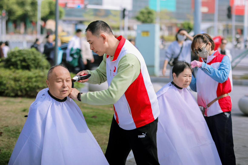 便民服务区则是另一番烟火景象。义剪摊位前,两位理发师志愿者剪刀翻飞,老人眯着眼享受“星级服务”:“小姑娘,给我剪精神点,一会儿还要去跳舞呢!”志愿者笑着应道:“阿姨放心,包您成为广场上最靓的那一个!”
