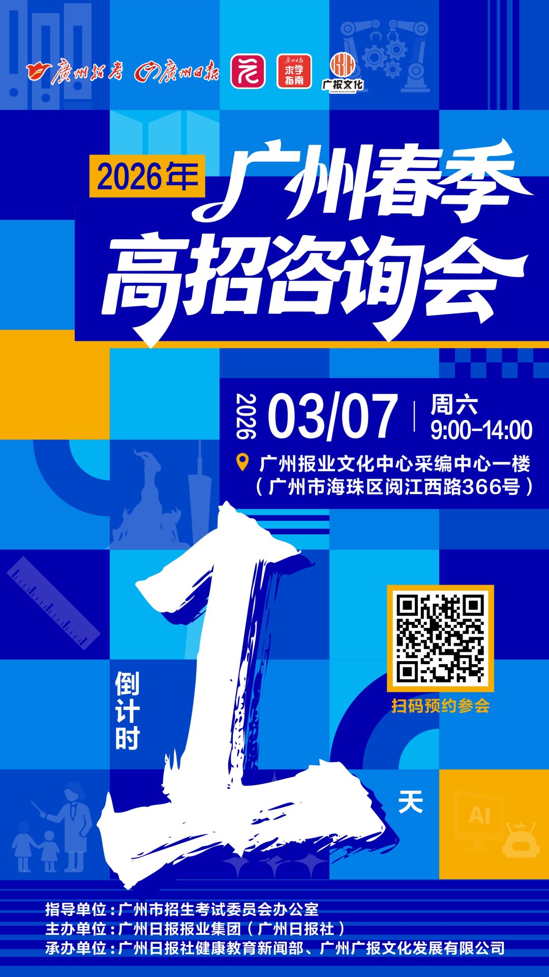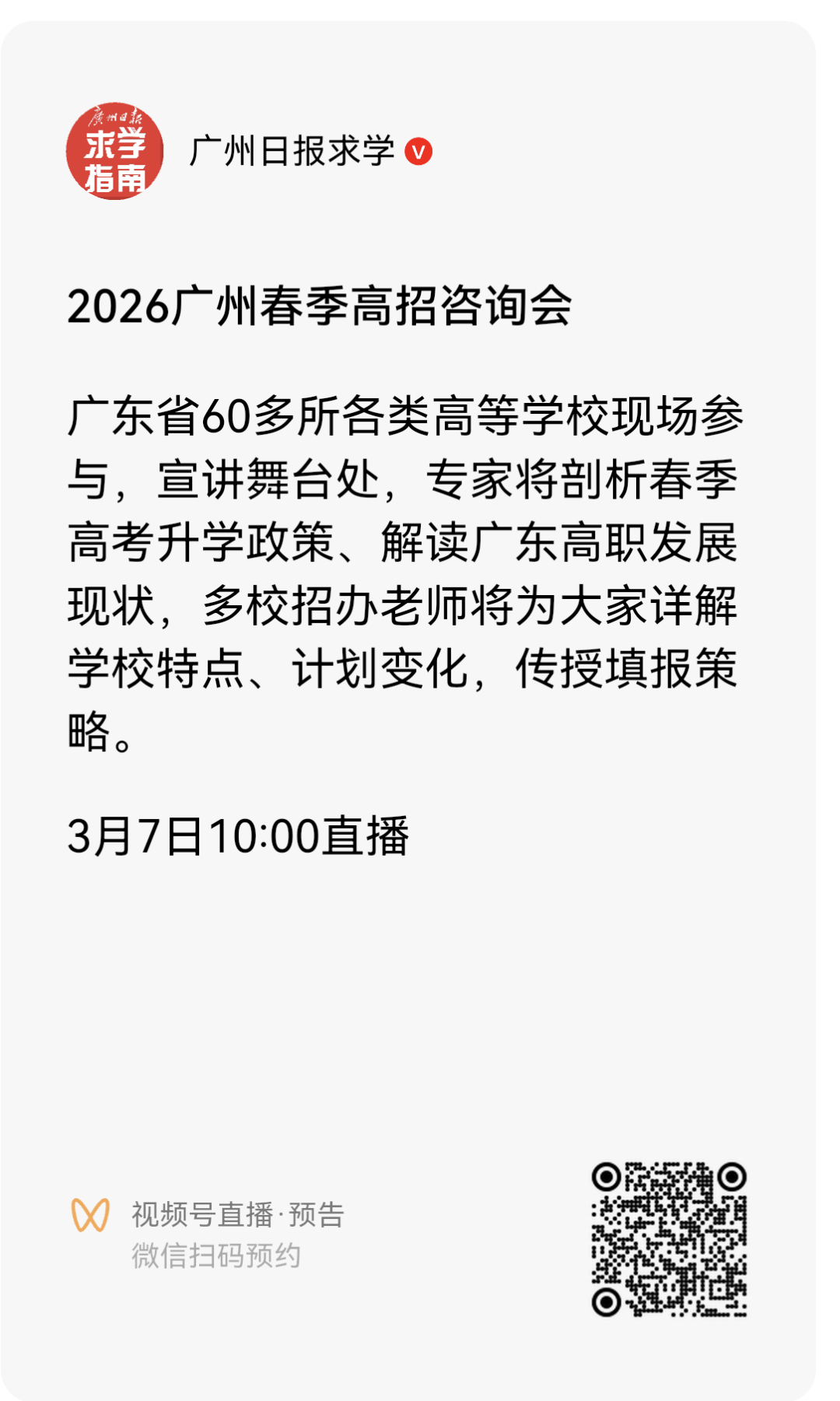 为助力考生精准填报院校志愿,持续提供在地服务,2026年广州春季高招咨询会定于3月7日9:00—14:00在广州报业文化中心采编中心一楼举行。活动由广州市招生考试委员会办公室指导,广州日报报业集团(广州日报社)主办,广州日报求学指南工作室、广州广报文化发展有限公司承办。