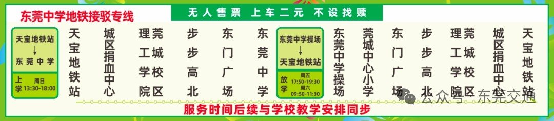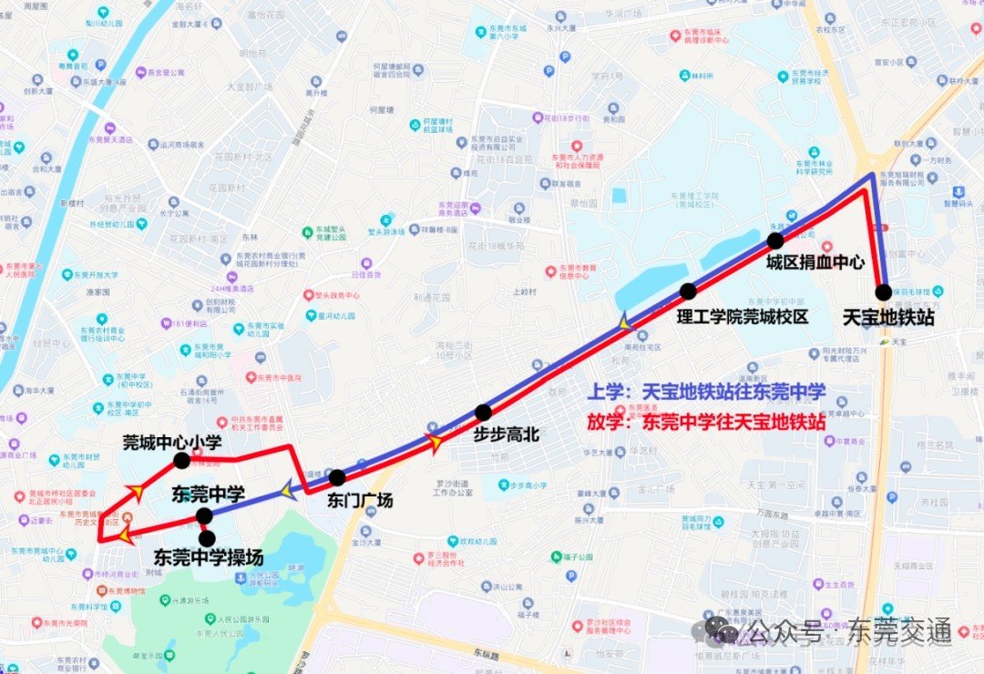 🚌停靠站点上学时段:天宝地铁站、城区捐血中心、理工学院莞城校区、步步高北、东门广场、东莞中学。放学时段:东莞中学操场、莞城中心小学、东门广场、步步高北、理工学院莞城校区、城区捐血中心、天宝地铁站。