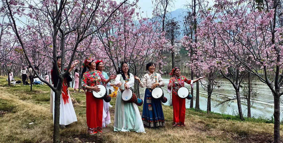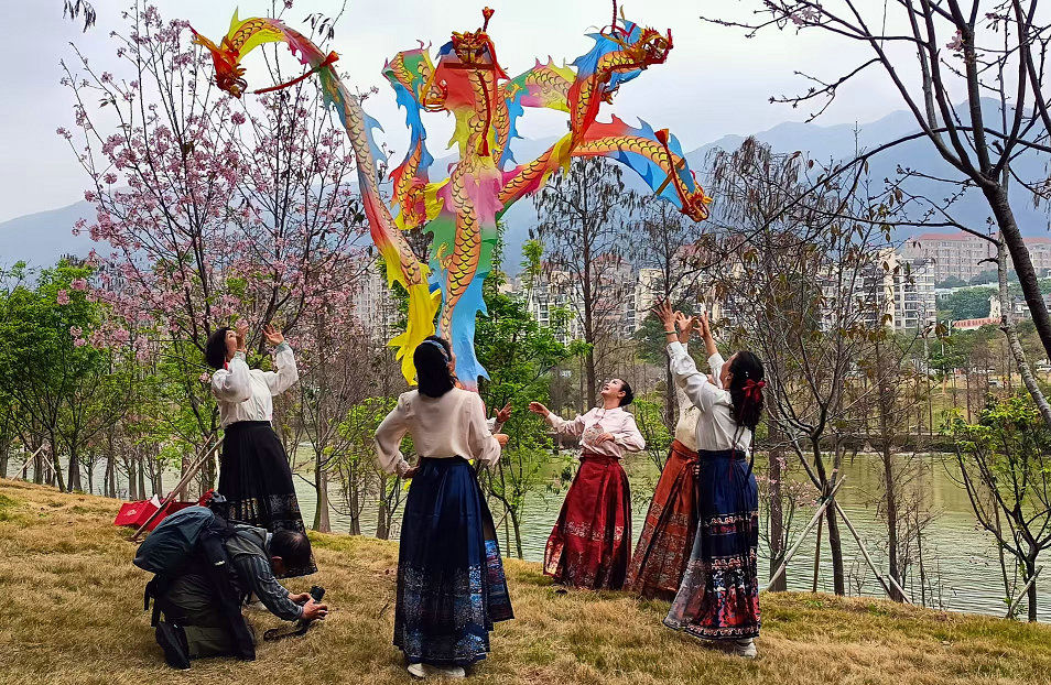 身着精美传统服饰的“花仙”们翩翩起舞,为游客送上春日祝福;而肩挎花篮的“簪花郎”则会沿途免费赠花,热情引导大家打卡留念,定格最美春光。