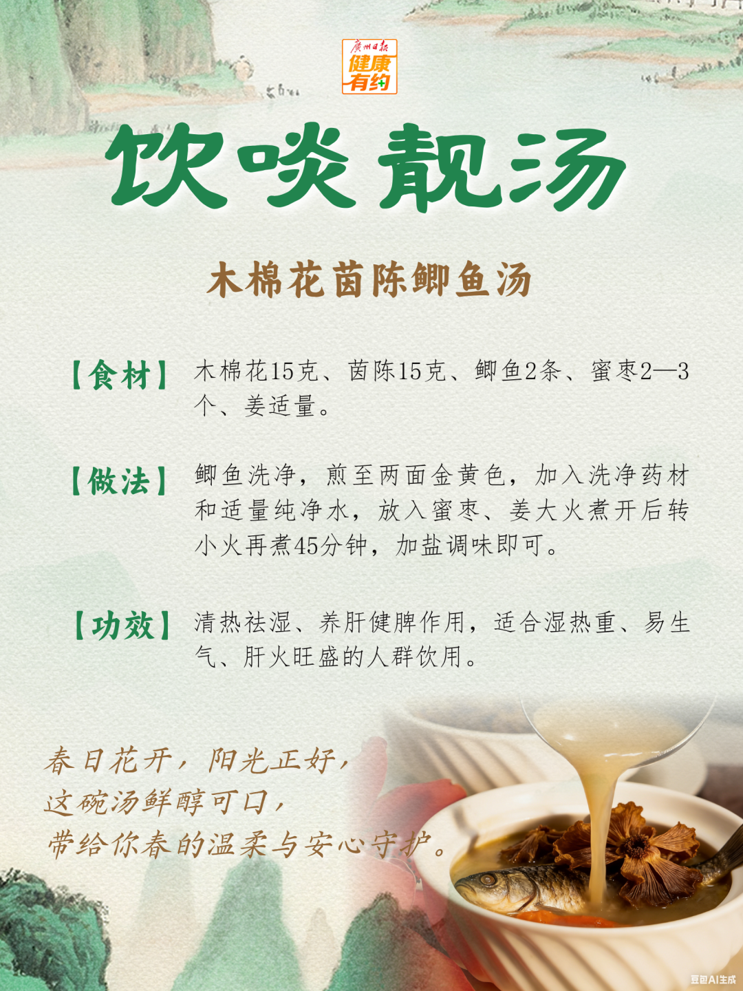 今天就给大家推荐一道“木棉花茵陈鲫鱼汤”,具有清热祛湿、养肝健脾的功效,适合湿热重、易生气、肝火旺盛的人群饮用。