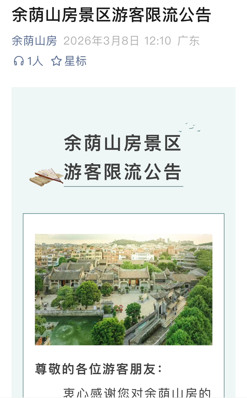 衷心感谢您对余荫山房的喜爱与支持!3月8日景区游客接待量持续攀升,已趋于饱和状态,为切实保障各位游客的游览安全与体验感,更好保护景区文物古迹与生态资源,结合景区核定承载量标准,余荫山房景区自2026年3月8日12:30起实施游客限流管理。