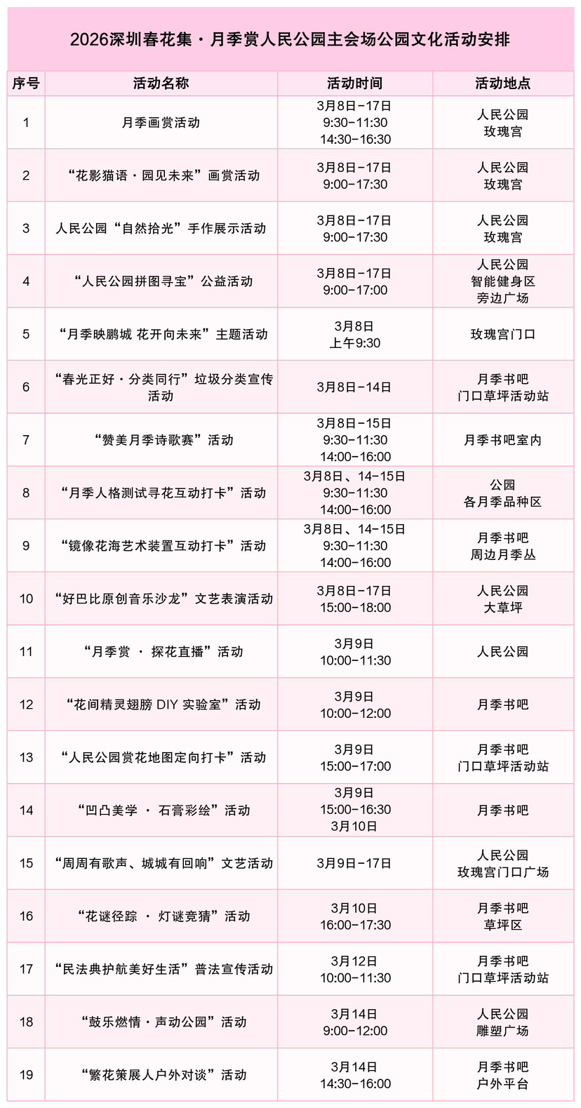 本届月季赏花节主会场落户素有“中国南方月季中心”美誉的罗湖人民公园,园区依托原生态景观,打造3.5万平方米特色赏花区,集中展出约300个月季品种。花意溪畔、主园路沿线时令花卉相映成趣,创意竹编花艺装置点缀其间,东门出入口、贝壳亭等标志性景点经艺术彩绘焕新亮相,自然景致与人文艺术交融共生。园内精心布设繁花映景、杉影花廊、雅韵满园、花间雾语、春苑绽芳、花径云廊六大观赏区,总面积从数百平方米至两万平方米不等,移步换景,诗意盎然。花展期间,玫瑰宫将举办三场主题画展,拼图寻宝、月季人格测试打卡、镜像花海艺术装置体验等互动活动轮番登场,让游园充满趣味与惊喜。
