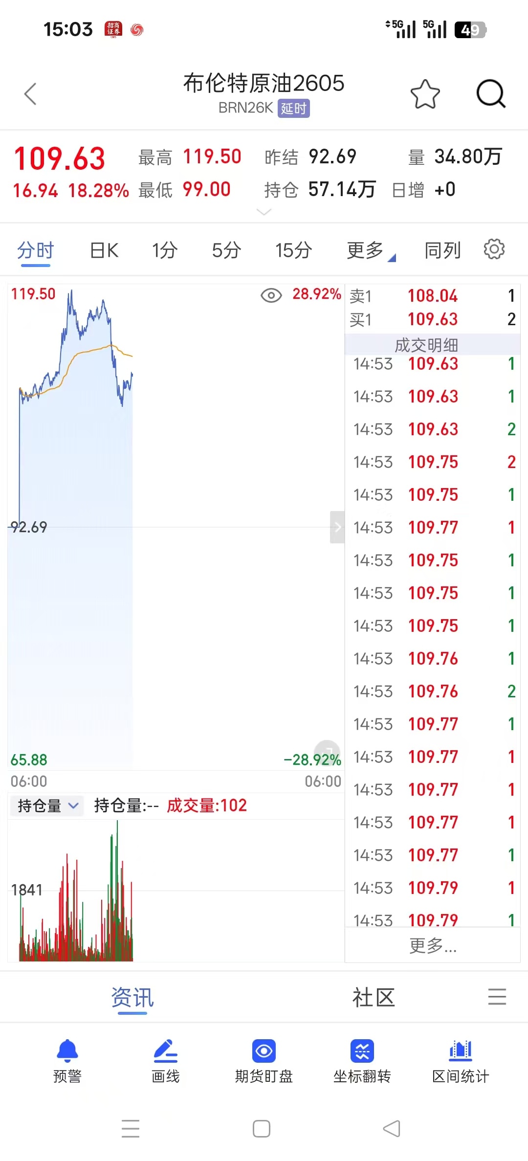 3月9日午后,国际油价直线跳水。WTI原油期货、布伦特原油2606合约纷纷掉头向下。截至下午4点许,WTI原油期货降至约103美元/桶,不过依然比开盘价涨约13%;布伦特原油期货降至约107美元/桶,依然比开盘价涨约15%。而至下午5点半,WTI原油期货一度降至100美元/桶下方。