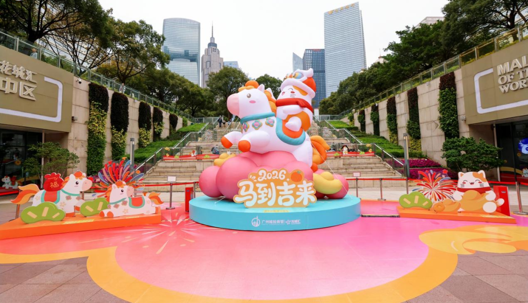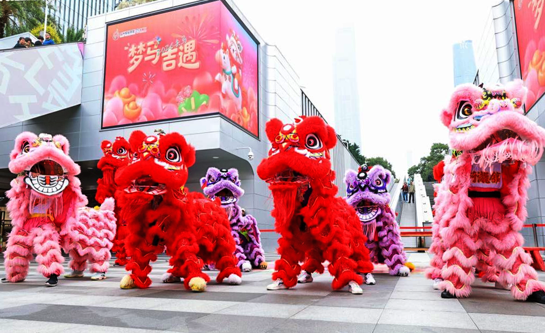 新春系列活动期间,花城汇下沉广场醒狮采青拜年,鼓乐表演,财神与狮队巡游商户拜年,送上“财源广进”的美好祝愿。中区“马到吉来”主题美陈装置以奔腾骏马为核心,融合传统纹样与现代灯光艺术,成为广州中轴线人气打卡点,吸引无数市民游客驻足留影。