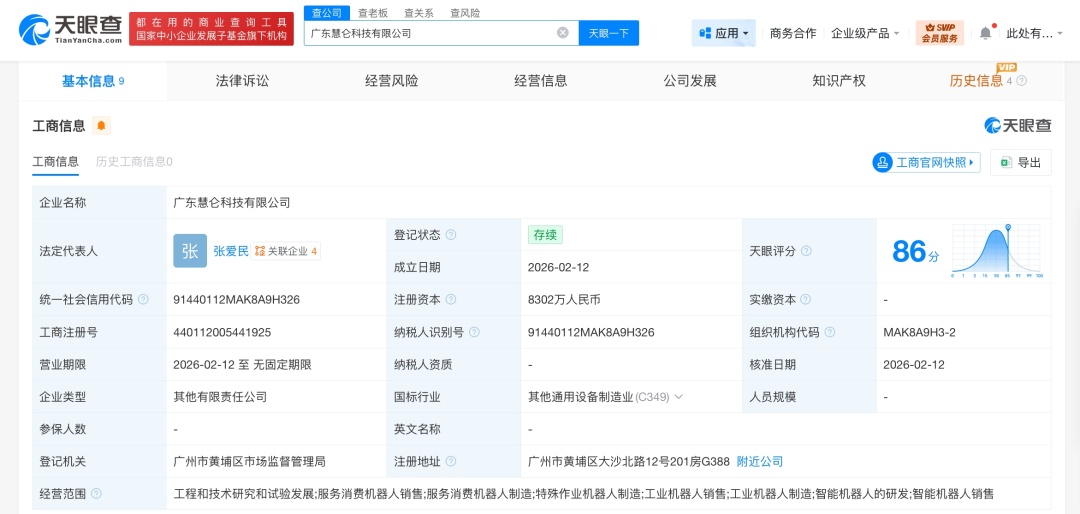 天眼查App显示,近日,广东慧仑科技有限公司成立,法定代表人为张爱民,注册资本8302万人民币,经营范围为工程和技术研究和试验发展、服务消费机器人销售、服务消费机器人制造、特殊作业机器人制造、工业机器人销售、工业机器人制造、智能机器人的研发、智能机器人销售等。