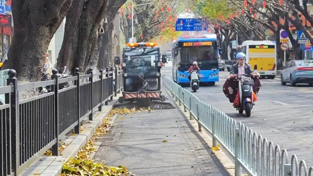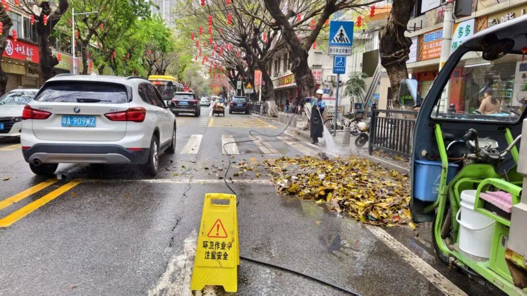 此外,针对不同路段分类施策:主干道每日出动大型机扫车联合作业,快速覆盖;慢车道、人行道灵活调度小型电动机扫车加密巡回;落叶密集路段则采取“冲洗归拢+人工收尾”组合打法,效率显著提升。2月25日—3月9日,累计出动235人次,清理落叶约20吨。