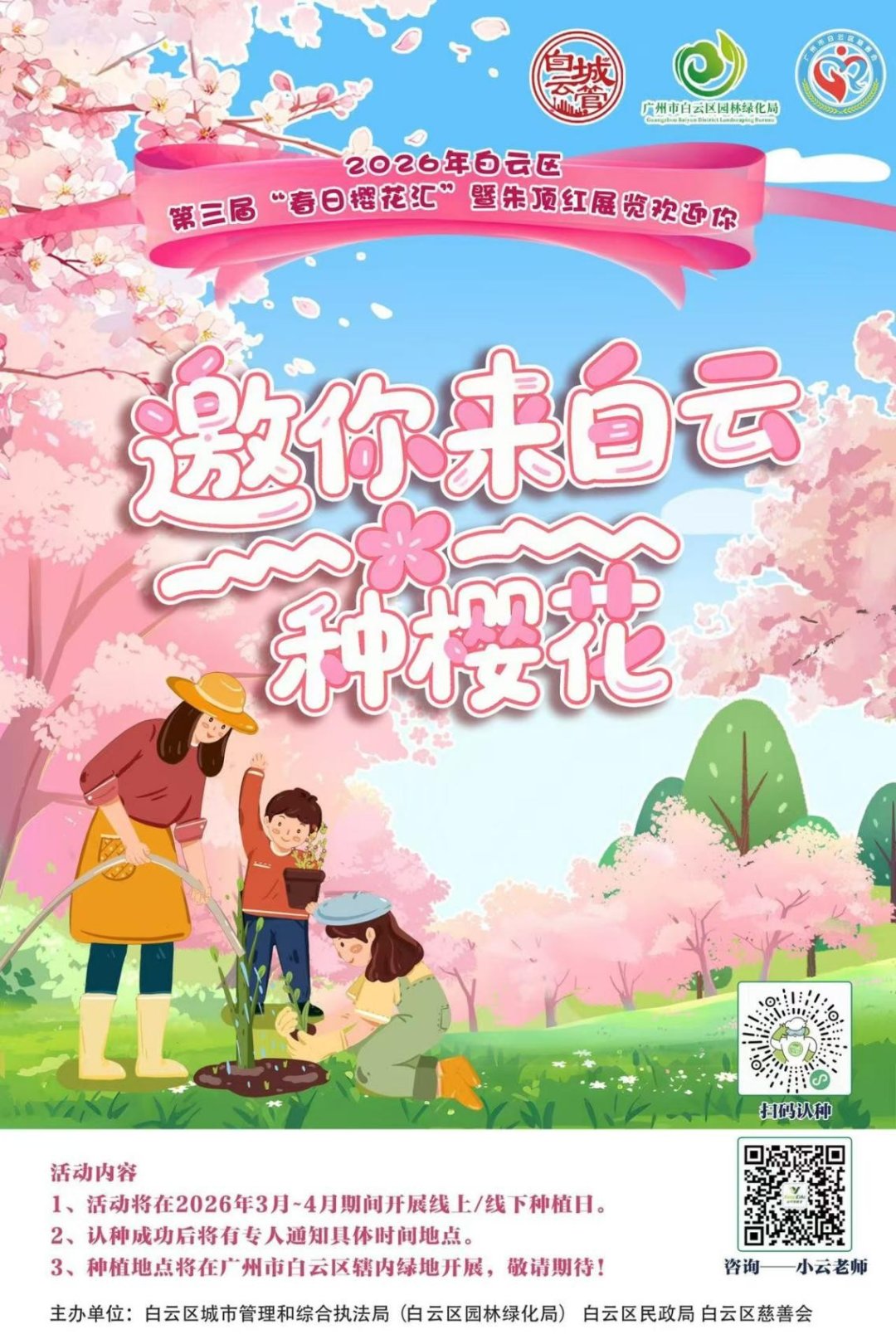 本届活动特别设置“共植樱花”认种认养环节,在樱花区域开放20株广州樱供市民认种认养。市民可通过“我在白云有棵树”线上平台报名参与,现场亲手种下一株樱花,见证它从幼苗到花海的成长历程,为来年的樱花节充“植”加“芬”。