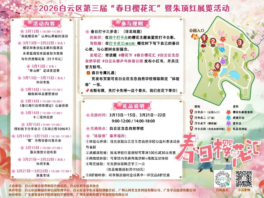 白云区城管局相关负责人介绍,本届活动内容丰富多元,现场设有樱花与朱顶红主题科普展、萌宠乐园方案展等静态展示,还将推出“与你共赏樱花美”互动打卡环节。市民可在樱花许愿树下写下春日心愿,在三大樱花主题装置前定格美好瞬间,发布小红书即可兑换限定体验券,解锁科普课堂、两爬互动、陶艺手作等专属福利。