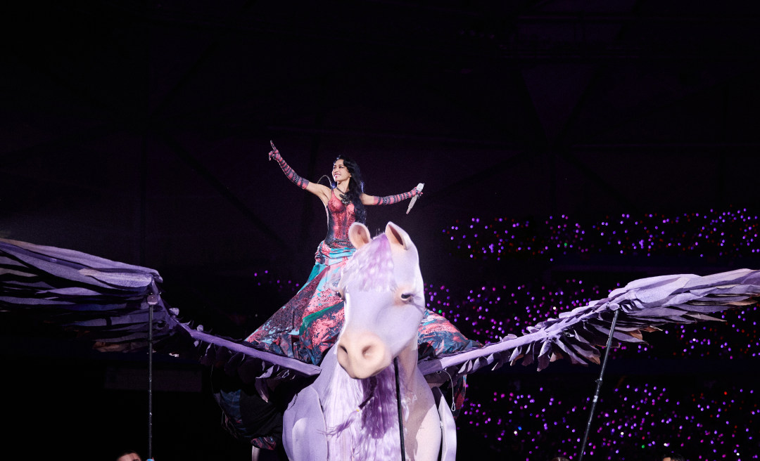 这场演唱会,堪称是一场满溢着愉悦与欢乐的沉浸式乐园体验。整场演出通过多项巨型装置,将这份快乐具象呈现:自动翻页的巨型书册铺展记忆;飞马、大象鱼等奇幻生物绕场巡游;“剑之丛林”更突破性地将中国传统非遗“爬竿”杂技融入表演,让千年技艺与现代舞台碰撞出震撼张力。除了舞台震撼,也有不少桥段,承载着独属于女性的温柔与坚韧,蔡依林将自我探索的勇气与力量传递给全场观众。