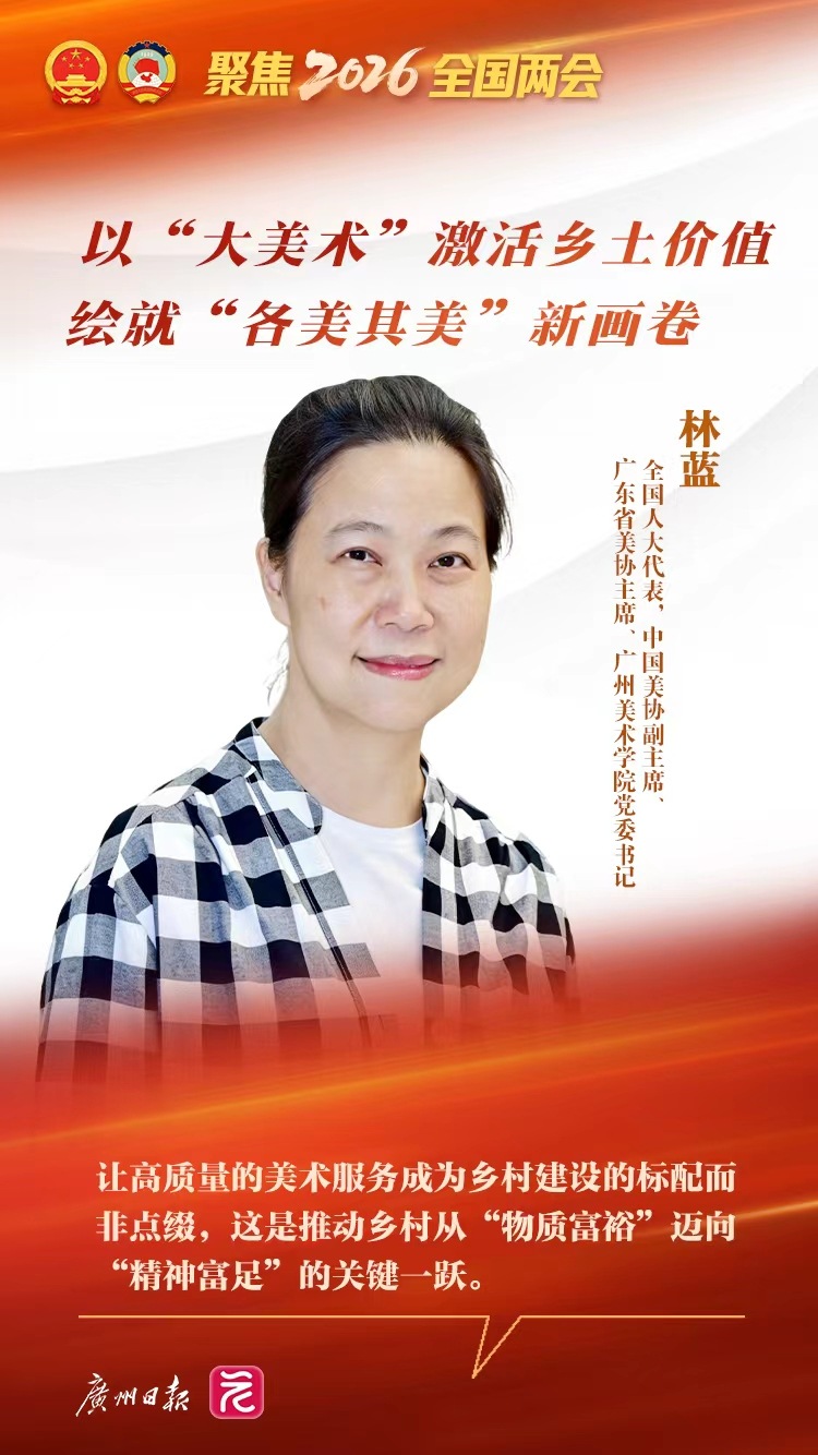 乡村振兴是实现中华民族伟大复兴的一项重大任务。为充分发挥美术在服务经济社会发展中的重要作用,因地制宜推进宜居宜业和美乡村建设,全国人大代表,中国美协副主席、广东省美协主席、广州美术学院党委书记林蓝建议在全国范围内推动构建“艺术赋能—产业升级—文化传承—生态优化”全链条发展模式,让美术设计成为乡村的“审美引擎”,成为激活资源、富厚民心的“金钥匙”。