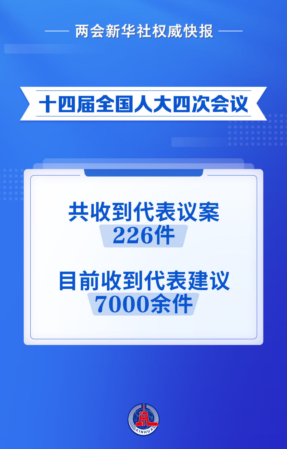 根据十四届全国人大四次会议主席团决定的代表提出议案的截止时间,到3月8日12时,十四届全国人大四次会议秘书处共收到代表议案226件。此外,目前大会秘书处已收到代表建议7000余件。