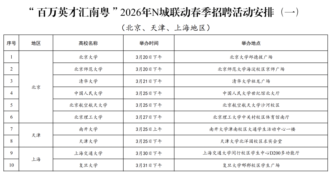 “百万英才汇南粤”2026年N城联动春季招聘活动安排(一)(北京、天津、上海地区)