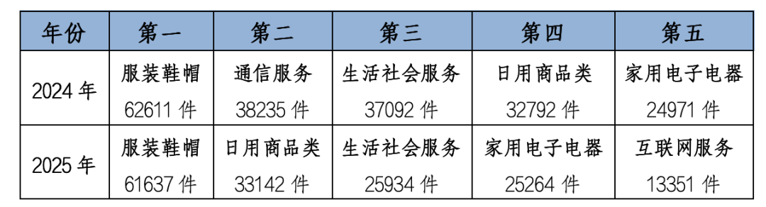 从商品类投诉内容来看,投诉量在前三的分别是:服装鞋帽类、日用商品类和家用电子电器类,与2024年保持一致。