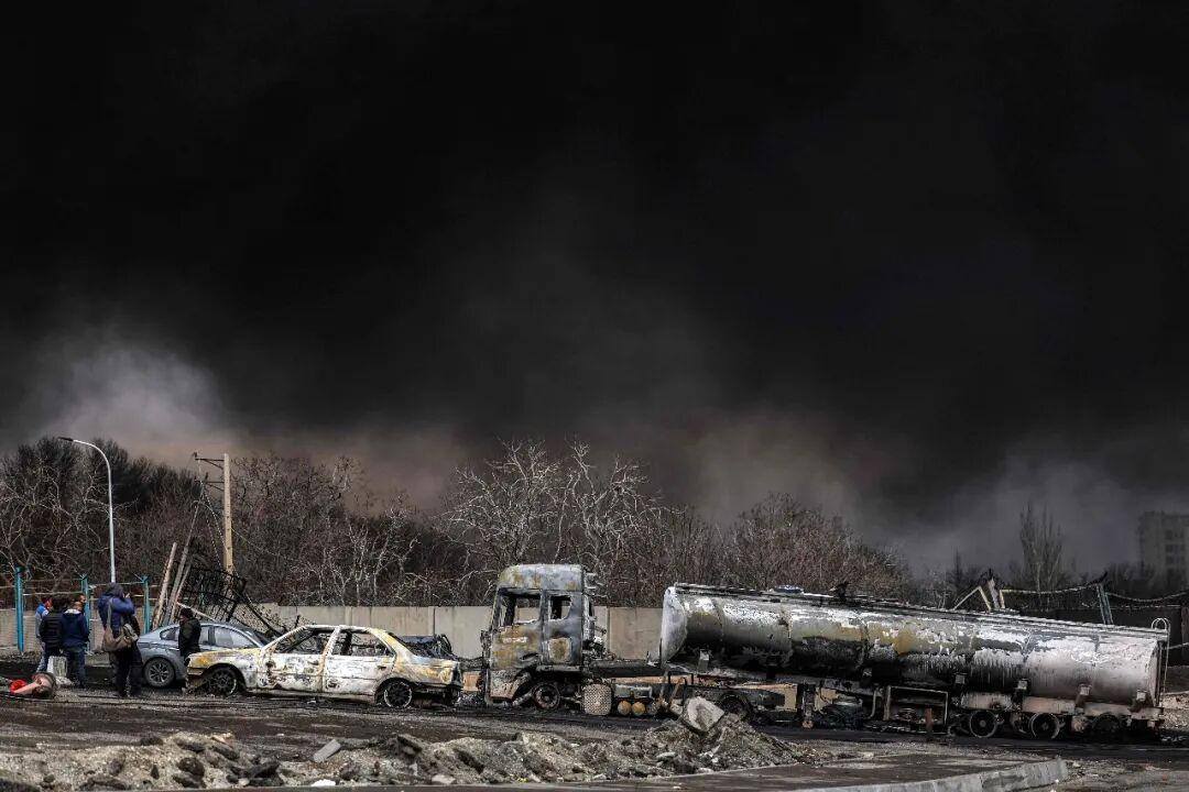 这是3月8日在伊朗首都德黑兰一处储油设施附近拍摄的损毁车辆和浓烟。新华社/法新