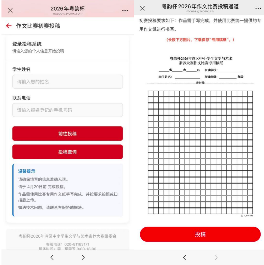下载路径为:点击粤韵杯专题首页“参赛投稿”按钮→点击作文比赛“初赛投稿”→在登录页面输入报名时所填写的姓名及电话→长按图片下载保存专用稿纸。