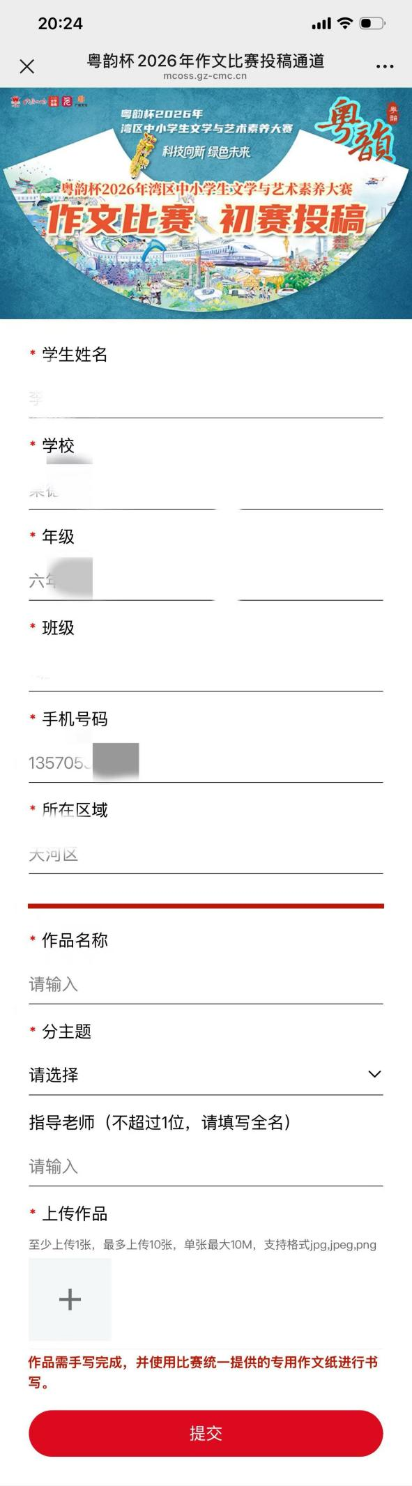 在作文比赛投稿页面点击“投稿”,投稿页面默认显示参赛者报名时填写的信息,参赛者须填写作品名称,选择分主题,并填写指导老师,点击“+”号上传作品图片,注意图片清晰、完整。提交成功后可查看已提交作品。