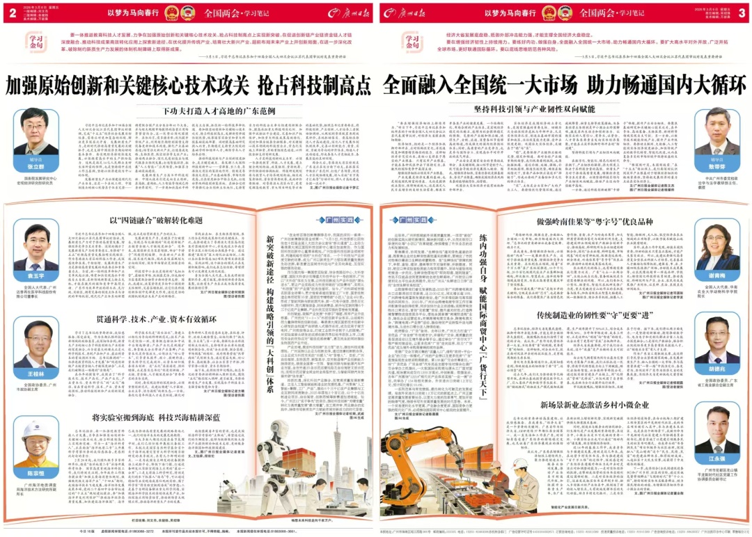聚焦习近平总书记下团组发表的重要讲话,我们依托《学习笔记》等品牌栏目第一时间组织学习。一是京穗连线学,3月6日、7日持续推出对版,邀请党校专家学者“接天线”学、邀请代表委员群众“接地气”学,还推出“广州实践”子栏目,从广州相关领域讲落实;
