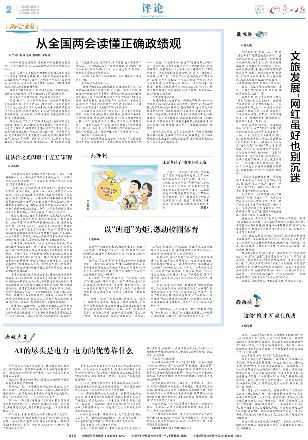 2026年全国两会胜利闭幕。这是在“十五五”扬帆起航关键节点召开的全国两会,也是广州日报报业集团(广州日报社)全面启动系统性变革以来的首次全国两会。广州日报成立报道专班,组建精锐团队,深入学习宣传贯彻习近平总书记系列重要讲话精神,将全国两会报道作为检阅系统性变革成效的主战场,紧扣学重要讲话、报大会盛况、看广东实践、展履职风采,坚持守正创新、锚定融媒传播,以好策划+新表达+潮技术+全形态,推出一系列高质量全媒体报道,打造两会报道的恢宏气势感、活力现场感、时尚科技感、扑面氛围感,倾“新”倾情描绘奋进“十五五”开局的中国豪情,用心用力讲好南粤大地勇挑大梁、再闯新路的决心信心。
