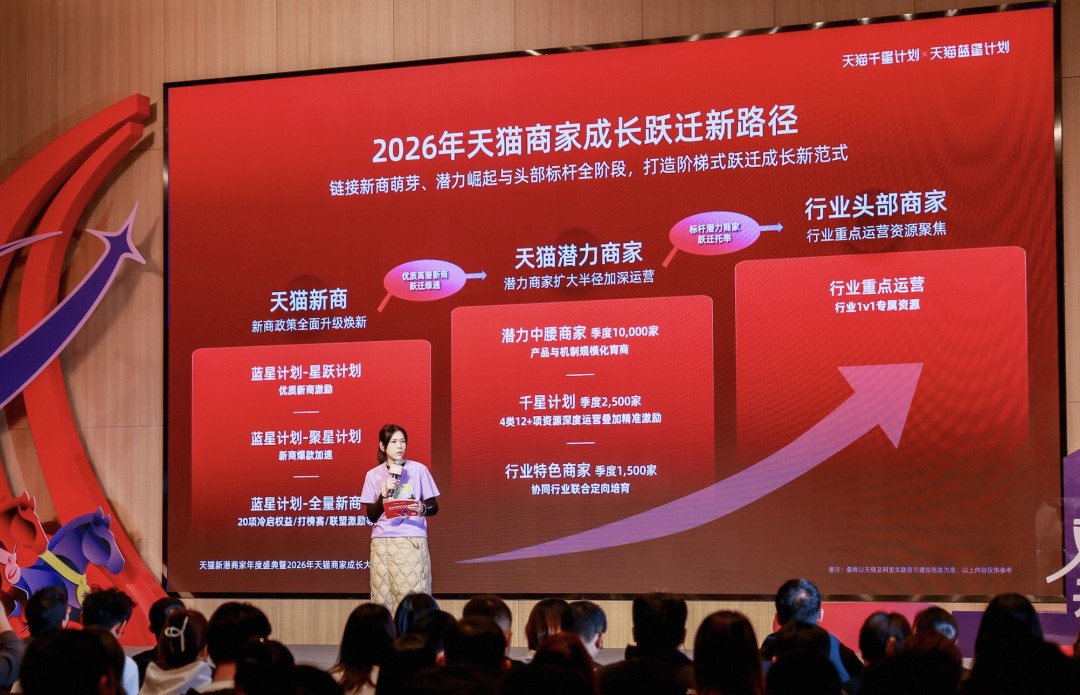 当下,创业活力持续涌动,越来越多优质商家选择天猫作为品牌创业的起点。数据显示,2025年,超15万个优质新商家在天猫创牌,开店当年成交即破亿元的品牌数量同比增长超40%。在千星计划的扶持下,有564个潜力品牌成为年度细分赛道第一,180个商家成长为行业头部。天猫始终是品牌经营第一阵地。