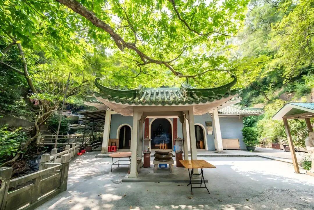 自然的鬼斧神工之外,人文的温度同样在此沉淀了约四百年。始建于明末的水月宫,藏在青山翠柏间,青瓦黛瓦映着流云,怀梓亭六和亭相映成趣,历经岁月沧桑。现存的石质古贡台上,“同治十三年九月吉旦”(1874)的镌刻清晰可辨,默默记录着过往的修缮印记。2023年,由香港广州南沙潭洲大岗灵山同乡会侨胞牵头修缮,新增“镜心水月”石牌坊、巨幅“十八罗汉”雕塑及蕴含本土文化特色的对联、牌匾与五言诗等,让这座古庙重焕生机,成为连接海内外乡情与千年文脉的精神纽带。