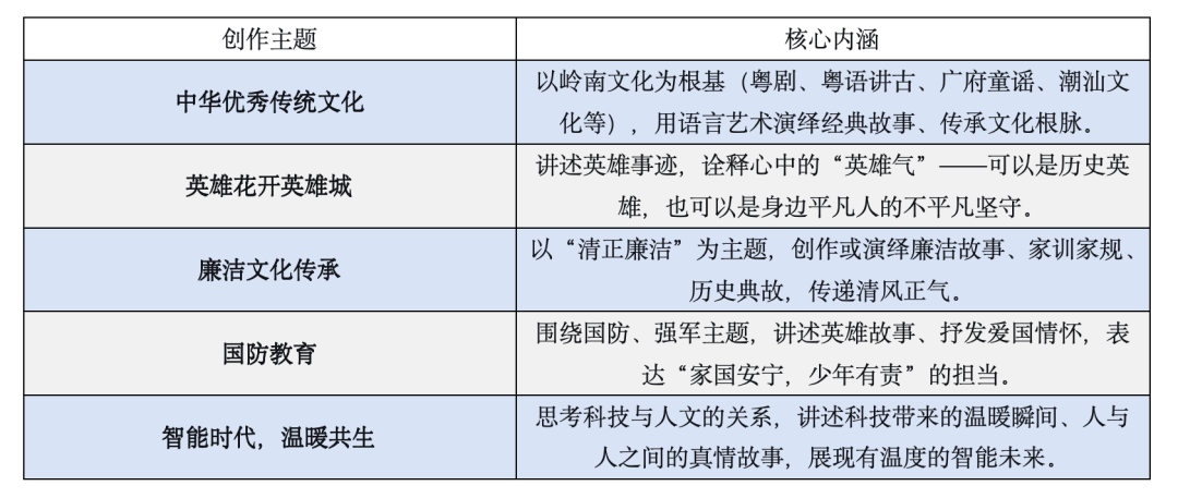 参赛作品应围绕“科技向新·绿色未来”的大主题,从以下五个内容方向中汲取灵感,进行歌曲演绎。作品须内容健康、积极向上,兼具思想性、艺术性与时代性,展现新时代湾区青少年的创造力、责任感和文化自信。