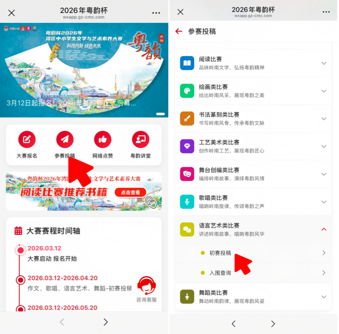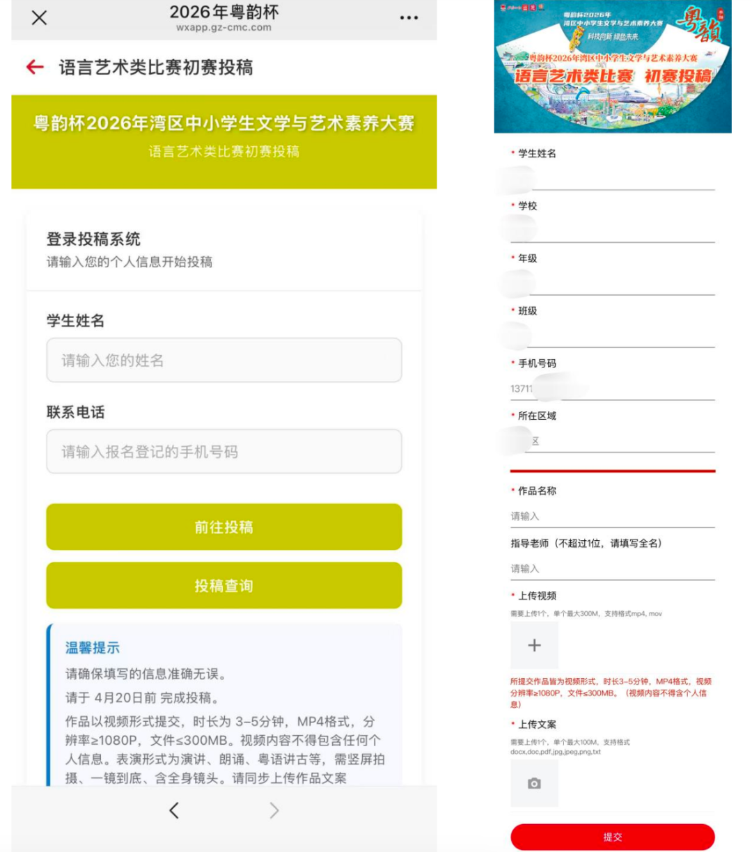 ②进入粤韵杯专题投稿,路径为:点击专题首页“参赛投稿”按钮→点击语言艺术类比赛“参赛投稿”→登录页面输入报名时所填写的姓名及电话,点击“前往投稿”→进入投稿页面输入作品名称和指导老师信息→上传作品视频→点击提交。