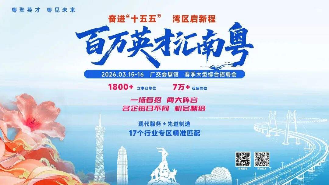 春风浩荡,南粤潮涌。3月15日至16日,“百万英才汇南粤”2026年春季大型综合招聘会将在广州广交会展馆D区盛大启幕。作为广东今年首场部省联办的高规格人才盛会,此次活动以“粤聚英才 粤见未来”为主题,汇聚全省21个地市优质资源,超1800家企事业单位同台揽才,逾7万个优质岗位集中释放——这是南粤大地向天下英才递出的一张分量十足的邀请函。