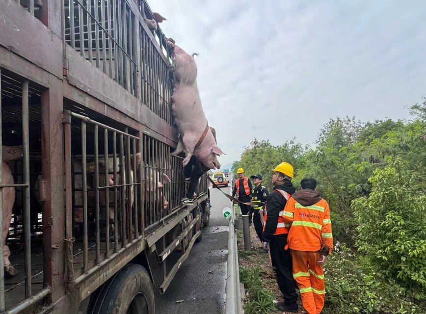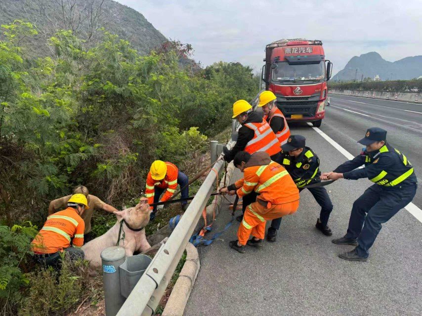 据了解,该货车驾驶员卢先生从湖南运载生猪前往佛山,车辆行驶途中因车厢围栏脱落,车上装载的生猪意外掉落,这才出现了开头求助的一幕。