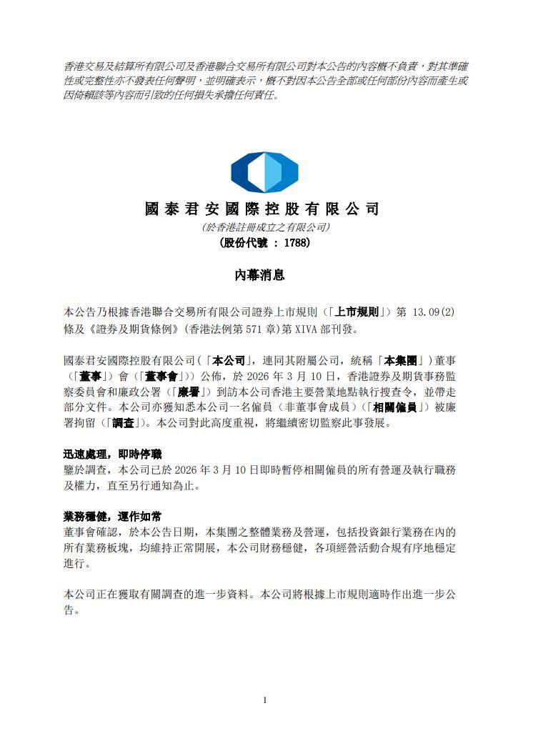 3月12日早间,国泰君安国际发布公告称,3月10日,香港证监会和廉政公署到访公司香港主要营业地点执行搜查令,并带走部分文件。此外,公司的一名雇员(非董事会成员)被廉政公署拘留。国泰君安国际在公告中进一步表示,对于被廉政公署拘留的雇员,公司已暂停相关雇员的所有运营、执行职务及权力。