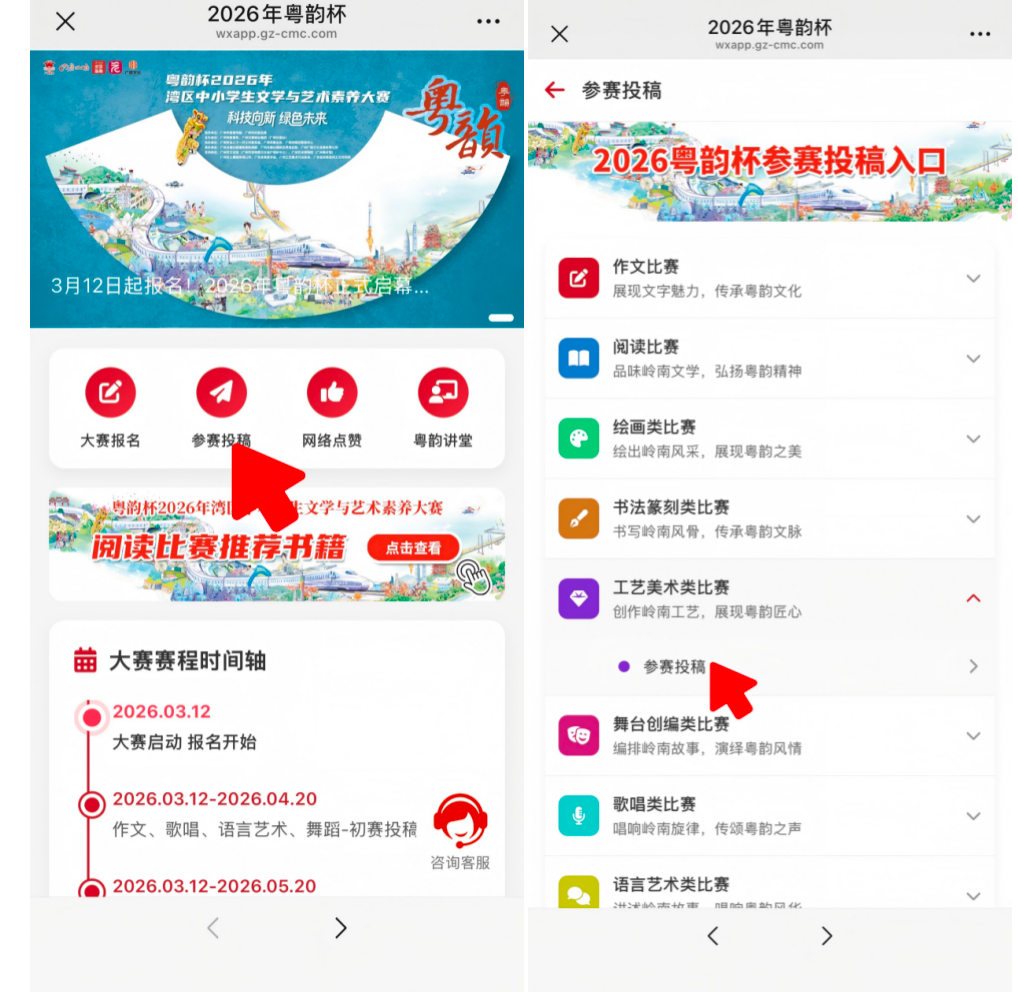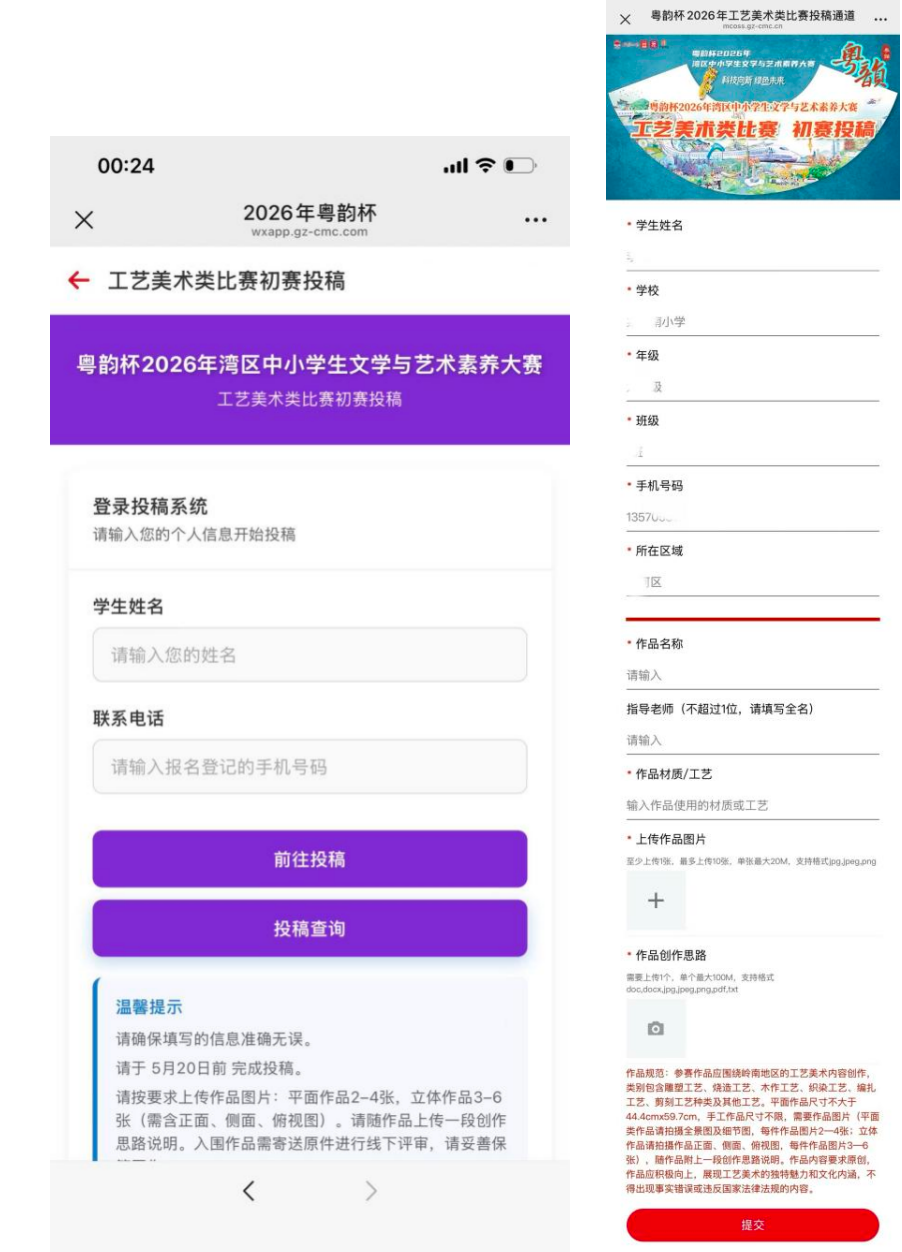 ②进入粤韵杯专题投稿,路径为:点击专题首页“参赛投稿”按钮→点击工艺美术类比赛“参赛投稿”→在登录页面输入报名时所填写的姓名及电话,点击“前往投稿”→进入投稿页面输入作品名称、指导老师和作品材质/工艺→上传作品图片及创作思路→点击提交。