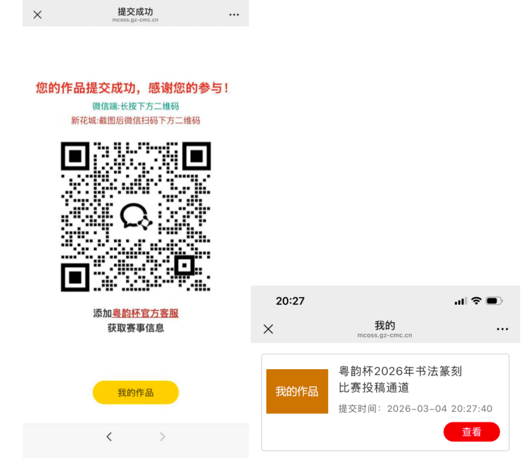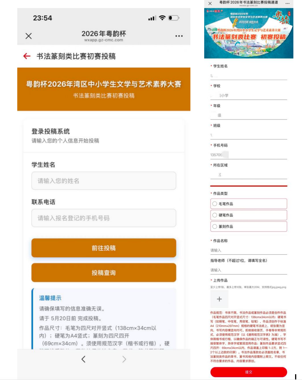 ②进入粤韵杯专题投稿,路径为:点击专题首页“参赛投稿”按钮→点击书法篆刻类比赛“参赛投稿”→在登录页面输入报名时所填写的姓名及电话,点击“前往投稿”→进入投稿页面选择作品类型、填写作品名称和指导老师信息→点击“+”号上传作品图片→点击提交。