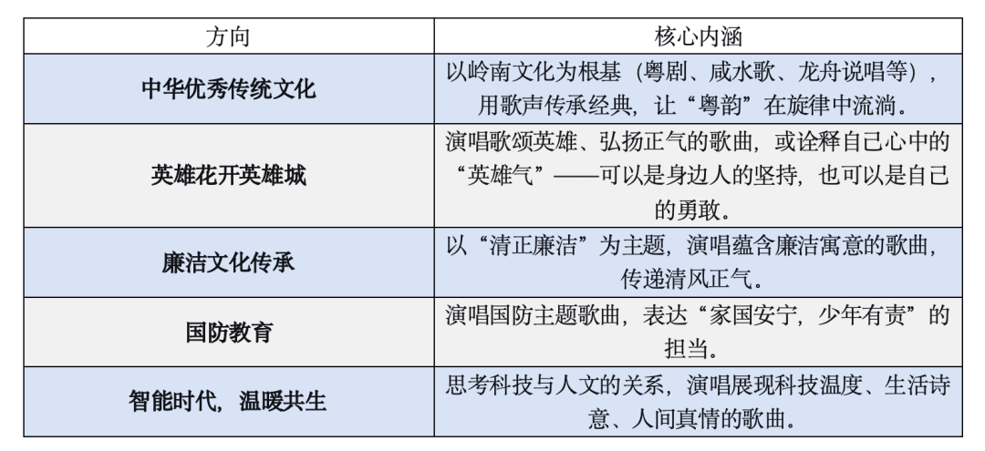 曲目风格:需在报名时标注歌曲风格,如民族、美声、通俗、岭南特色等。