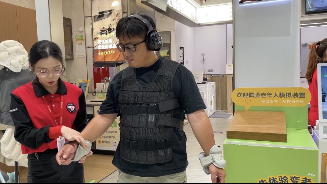 “我们的中医AI问诊区还吸引了很多中青年用户”,体验官蔡芷茵介绍,智享银龄馆首创的适老心智体验区,让年轻人能亲身感受长辈的真实需求,唤醒代际同理心。通过穿戴负重背心、关节束缚带、老化眼镜等装置,年轻人可亲身感受长者行动不便、视物模糊的生理状态;在安全环境下体验智能防摔气囊的瞬间保护,或通过轮椅模拟跑道理解不同路面的出行挑战。“穿上背心和关节装置后,抬手和行走之间都有一种沉重的负重感。”现场体验者马先生描述,“戴上模拟耳机的效果也非常明显,周围环境的嘈杂声都听不见了,离我很近才能听到说话。”在他看来,这种体验让年轻人提前体验了一把老年人身体退化的状态,也更理解父母日常生活中的不易。