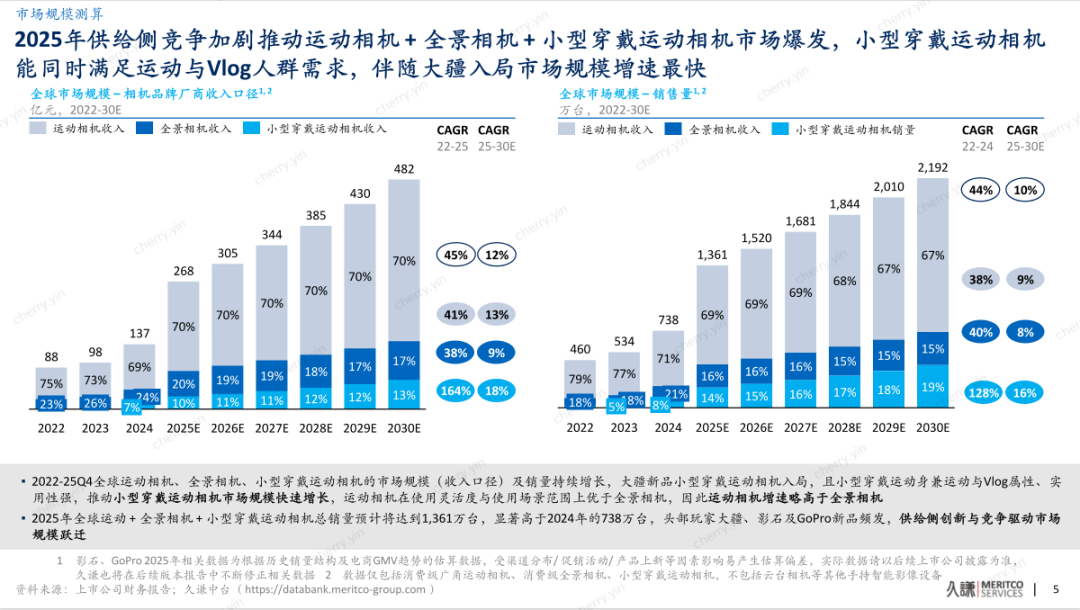 报告显示,2025年全球手持智能影像市场(含运动相机、全景相机、小型穿戴相机)迎来爆发,全行业收入同比增速达到96%。这一增长背后,是主流品牌密集的新品发布:大疆在三类相机上均推出新品,影石持续迭代旗舰机,GoPro亦重返全景赛道。丰富的产品供给,叠加滑雪、骑行等户外运动的持续火热,共同激活了消费需求。