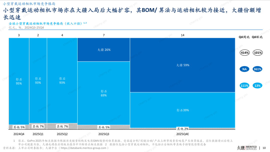 新赛道成功开拓:2025年下半年,大疆进入全景及小型穿戴相机新赛道后迅速起量。报告特别指出,大疆第一代全景相机Osmo360在Q3发布后讨论度高涨,“吸引大量尝鲜式消费者涌入”,直接推动了全景相机市场的快速扩容。Osmo Nano的发布亦使小型穿戴相机品类市场迅速扩大,已成为小型穿戴相机市场第一。