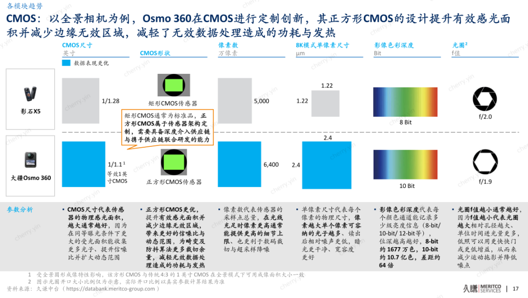 方形CMOS的定制化应用:报告指出,将正方形CMOS引入产品线是“行业的主要创新”。这一设计背后是基于用户“先拍摄后取景”理念及多平台发布习惯的深刻洞察。虽然定制方形CMOS需要“高昂的前期定制成本”和“较深的产品knowhow”,但它为用户带来了自由裁剪、无损画质的实用价值,体现了大疆在产品线上持续投入的决心。