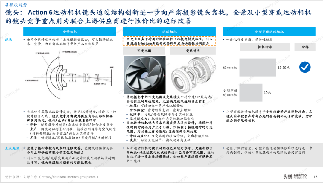 可变光圈突破耐用性瓶颈:报告重点分析了大疆最新发布的Action6,称其“首次在镜头中引入了可变光圈”。这一创新打破了运动相机为追求耐用性而长期采用固定光圈的传统。报告评价称,此举“扩展了运动相机的可拍摄题材,使得该品类进一步具备拓展市场边界、捕捉严肃摄影群体的潜力”,意味着运动相机从单纯的“记录工具”向“创作工具”迈出了关键一步。