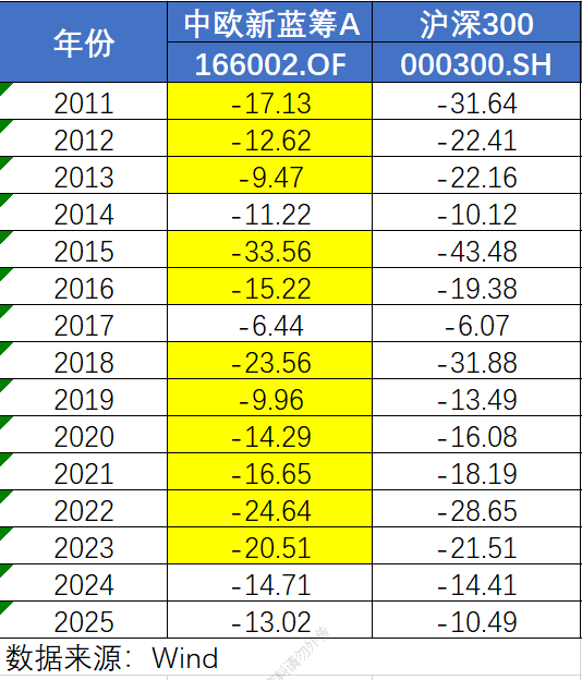 数据来源:业绩数据来源中欧基金并经托管行复核,指数涨跌幅及最大回撤数据来源Wind,截至2026/2/28。基金的过往业绩并不预示其未来表现,基金管理人管理的其他基金的业绩并不构成基金业绩表现的保证。中欧新蓝筹混合近一年、近三年、近五年、成立以来同期业绩比较基准涨跌幅分别为13.02%、15.50%、1.83%、91.11%。周蔚文管理以来的同期业绩比较基准涨跌幅为71.35%;年化净值同期业绩比较基准涨跌幅为3.71%。排名数据来自银河证券,截至2026/2/28,同类为银河证券分类,中欧新蓝筹A为偏股型基金(股票上限80%)。中欧新蓝筹A的业绩比较基准从2011年到2025年每年的最大回撤分别为:-19.26%、-13.27%、-13.27%、-5.98%、-28.02%、-11.84%、-3.61%、-18.64%、-8.07%、-9.67%、-10.52%、-16.93%、-12.26%、-8.10%、-6.06%。