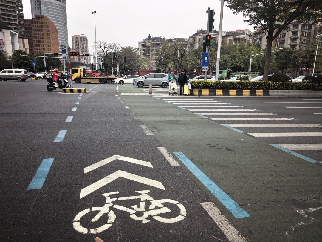 聚焦重点路口的拥堵点和冲突点,禅城区坚持“微改造、精提升”理念,以“小投入”实现“大成效”。在卫国路—汾江中路等路口,结合通行特点和路口实际尺寸,创新利用转角空间和非机动车专用道,设置了“右转警示危险区”与“电动自行车直行待行区”,通过“空间换时间”的模式,让非机动车在红灯期间提前进入待行区域,高峰期非机动车过街效率提升约40%,等候秩序得到明显改善;针对岭南大道—同济路、季华路—岭南大道等5个核心主干路交叉路口,通过拓宽路口坡道、拆除止车柱、扩容渠化岛等候区、增宽二次过街安全岛等系统性改造,有效拓展非机动车停车与通行空间,使路口非机动车疏散效率平均提升约30%,高峰期电动自行车在路口对向而行的“对冲性拥堵”明显减少,通行安全性和顺畅度显著增强。