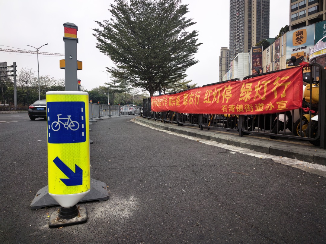 “以前在岭南大道—同济路路口,骑电动车经常遇到路口的石柱阻挡,一不小心还会撞到膝盖和腿,车流量大的时候,大家都被石柱堵住,高峰期要等两三个红绿灯才能过去,现在改造后,石柱大大减少了,非机动车过街快多了!”经常往返禅城、南海的快递员小张,对路口改造带来的变化赞不绝口。