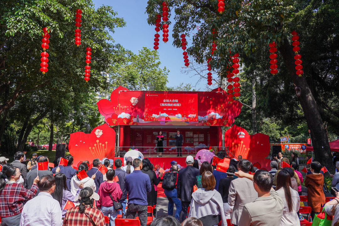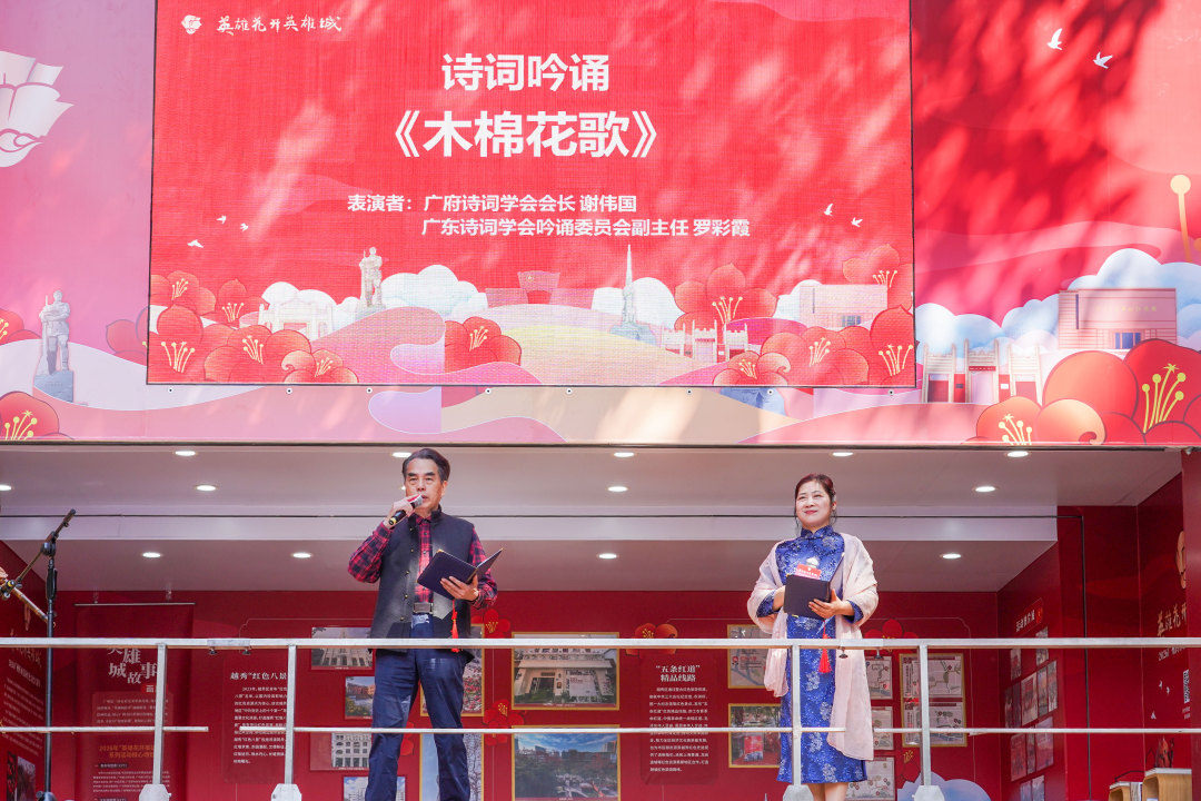 活动伊始,越秀区旧部前小学舞蹈队带来舞蹈表演《木棉花开》,用跃动的身姿展现出昂扬向上的精神风采;乐府学会吟诵研究会特聘专家谢伟国与广东诗词学会罗彩霞吟诵清代陈恭尹的《木棉花歌》,将木棉的英雄气概展现得淋漓尽致;朝天小学范配辛、周皓宁两位同学带来粤语相声《一对一》表演,在一捧一逗间展现了粤语相声的妙趣与智慧,博得现场观众阵阵掌声;广州本土知名歌手梁山山献唱粤曲《红棉颂》以及《大湾鸡我爱你》,瞬间点燃现场气氛;最后,来自越秀区音乐协会的刘革喜和越秀区文化馆的陈敏颖用一曲《我和我的祖国》,带动全场大合唱,激昂的旋律与赤诚的心声交织,在会场内久久回荡……海珠广场上,一辆木棉花造型的大篷车正化身“流动舞台”,为市民送上丰富的“文化大餐”。