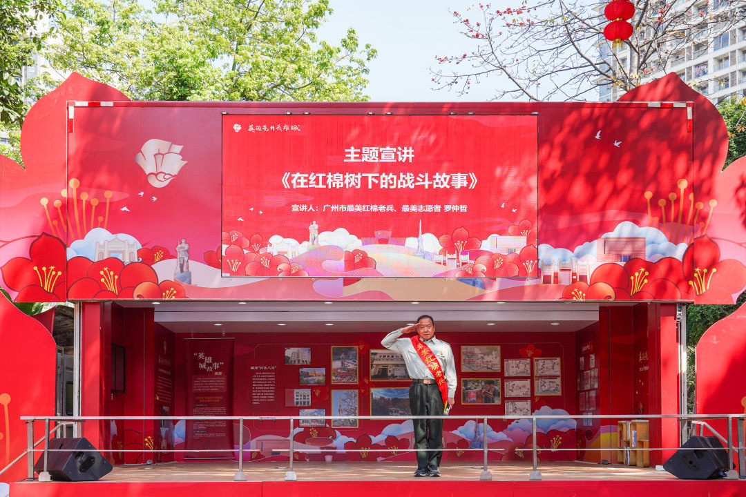 越秀区新青年宣讲员、来自北京路文化核心区管委会的李颖红深情讲述革命先烈杨殷同志,以北京路上的陈李济药厂作为革命工作的联络点,组织工会、发动工人参加革命斗争的故事;广州市最美红棉老兵、越秀区关工委“五老”红色宣讲团成员罗仲哲分享了他在英雄精神浸润下成长、参军参战报国的故事。对越自卫反击战前夕,罗仲哲在上衣口袋里留下“若我牺牲,请作党费”的字条,里面夹着12块钱。战争期间,他作为爆破手第一时间冲出友谊关,与战友们在枪林弹雨中冲锋陷阵,立下三等战功。现场,罗仲哲还展示他为牺牲战友画的素描画像,观众纷纷动容。如今作为红棉老兵,他依旧坚持参加各种志愿活动,用实际行动传承红色基因。