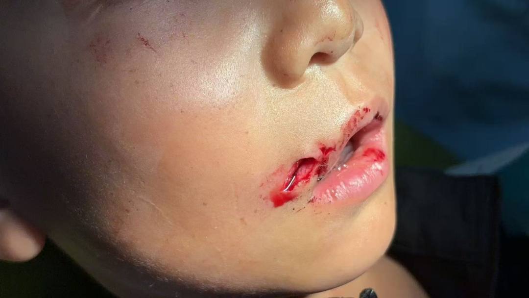 邓女士表示,她是在孩子前往医院紧急处理后的第二天才回到现场,拨打报警电话调取了监控,却发现本来对向的两个摄像头其中有一个“正在测试”,刚好无法提供孩子受伤时更准确的视频。“孩子在医院光缝针就缝了两个多小时,医生说伤口并不是牙齿磕碰贯穿的,可能是尖锐物品造成的。”