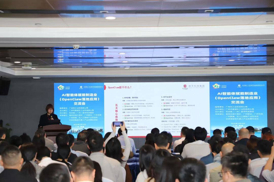 近段时间,开源AI智能体OpenClaw(俗称“龙虾”)全网火爆。3月13日,在广州市工业和信息化局指导下,广州开发区、黄埔区举办“AI智能体赋能制造业暨OpenClaw落地应用交流会”。活动现场座无虚席,通道内也站满了参会人员,气氛热烈。AI专家、三大运营商代表、企业负责人及行业人士汇聚一堂,科普“养虾”知识,开展案例解析,搭建对接平台。一场交流会,展现了广州开发区主动拥抱AI的姿态,也为当下AI赋能两业融合提供了生动注解。