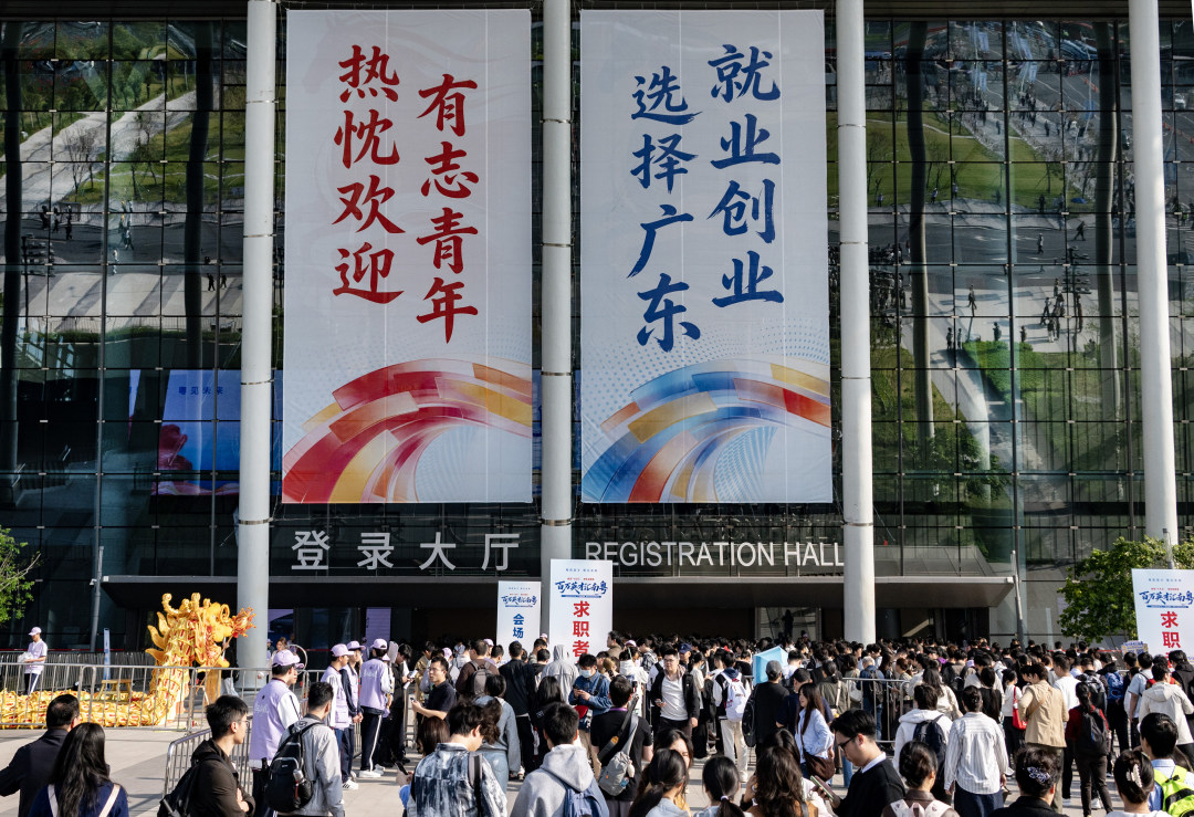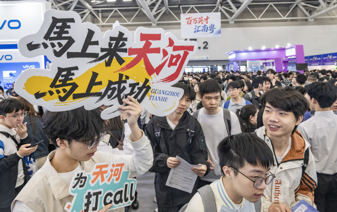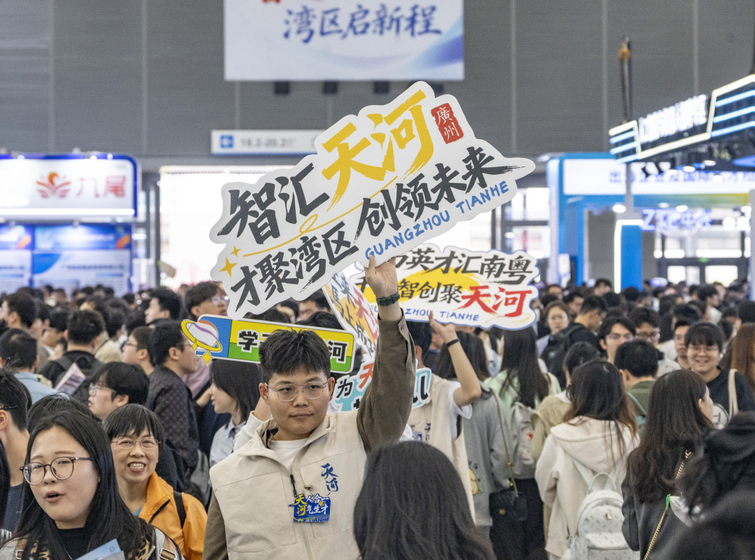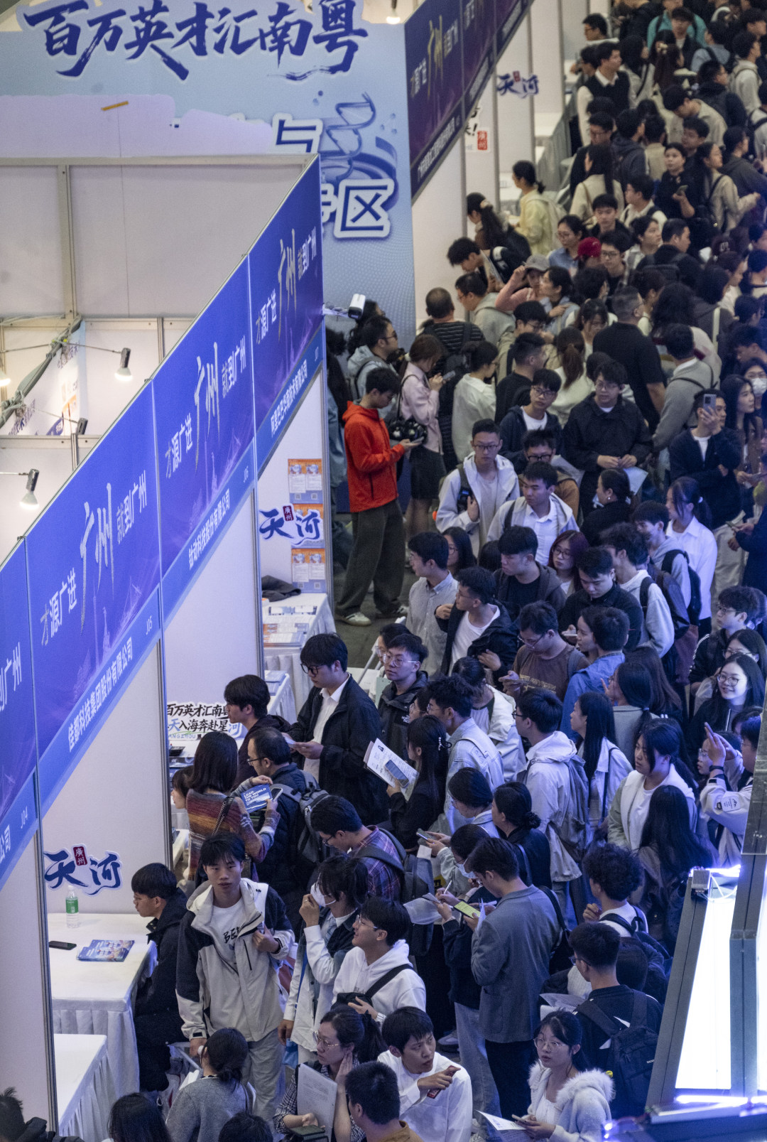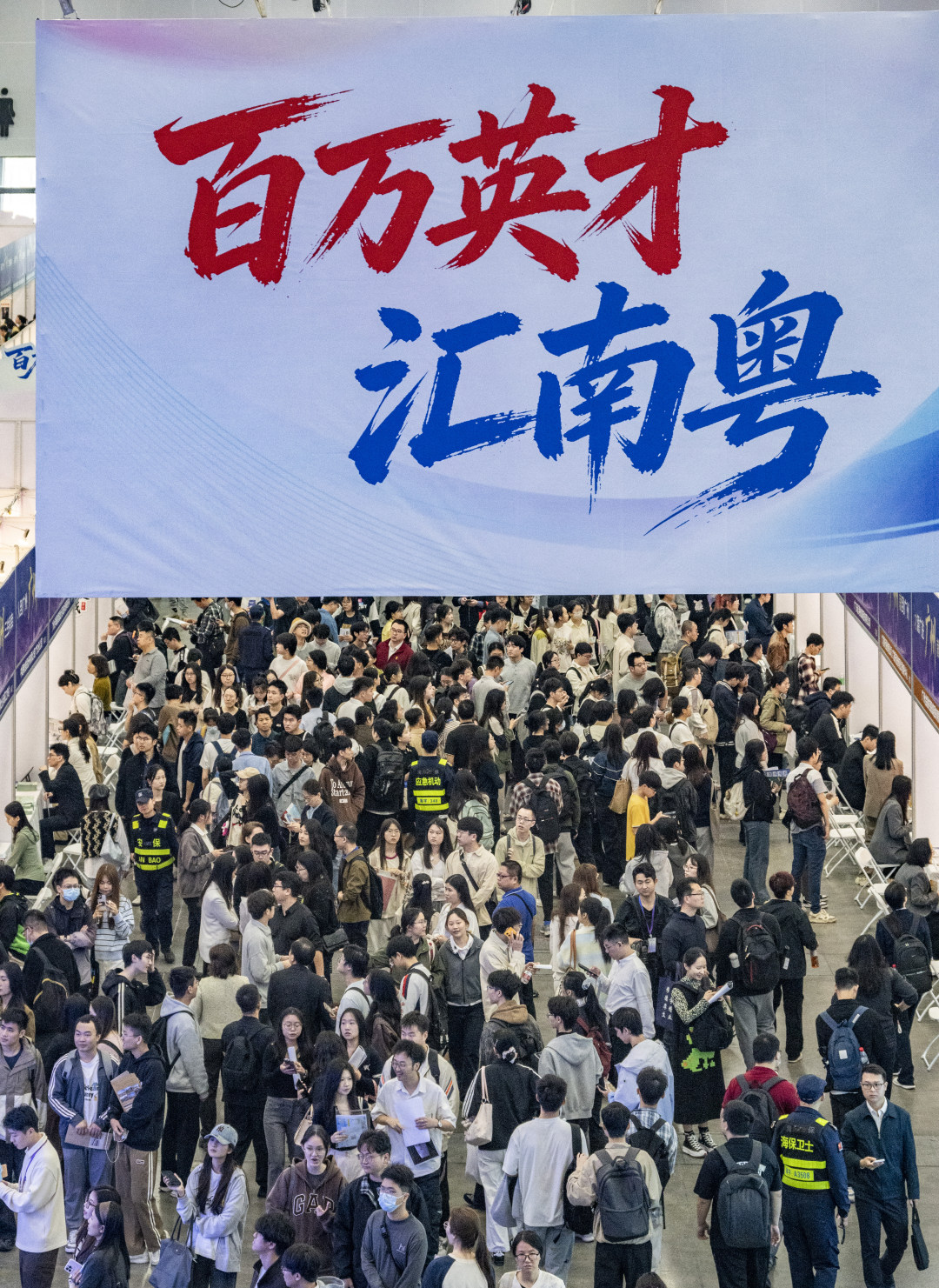 招聘会现场人流如织,天河区志愿者举牌招揽人才。