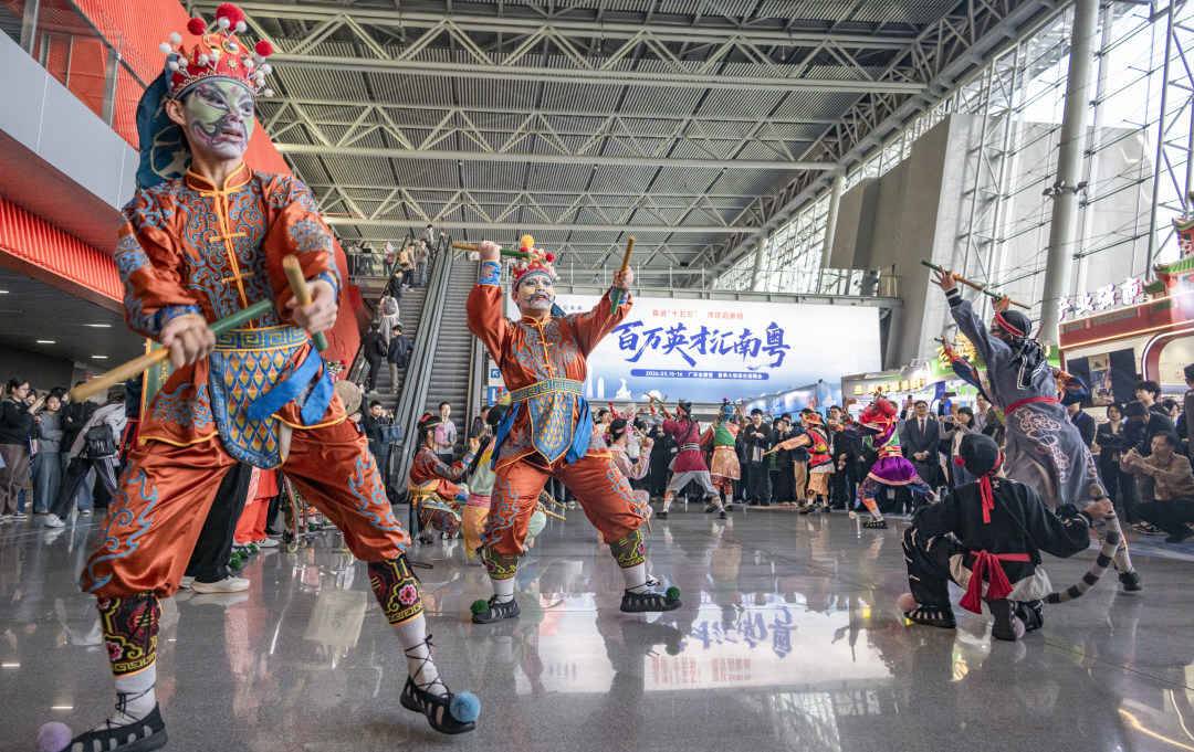 “奋进之路”展区前的英歌表演。