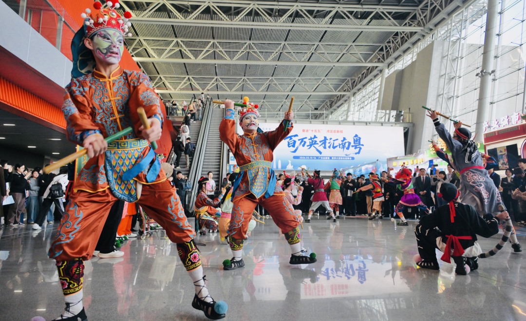 3月15日,“百万英才汇南粤”2026年春季大型综合招聘会在广交会展馆盛大启幕。展馆内,近两千家企业携8.5万个岗位齐聚,青年学子纷至沓来,现场气氛热烈如潮;面试招聘之外,英歌舞铿锵、舞龙腾跃、嘉禾望岗旋律回荡,潮玩市集与非遗手作相映成趣,地道广式美食香气四溢,交织成一幅活力四射的岭南生活画卷。岗位与文化同台,青春与城市相遇,南粤以“招聘+文化”的双重魅力,让每一位求职者不仅收获机遇,更能沉浸式感受浓浓的广东文化味。