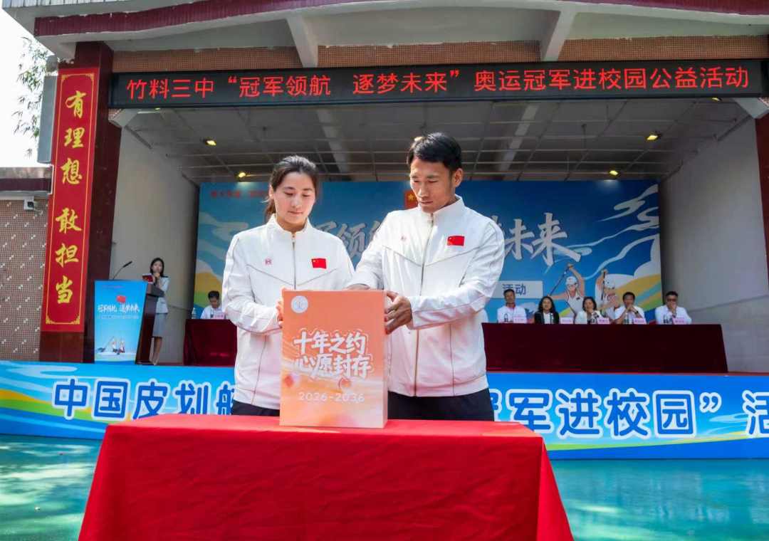同学们踊跃地向奥运冠军提问活动中,学生代表将写满心愿的“梦想信笺”郑重存入时光箱,两位冠军亲手签名封印,约定2036年共同开启。